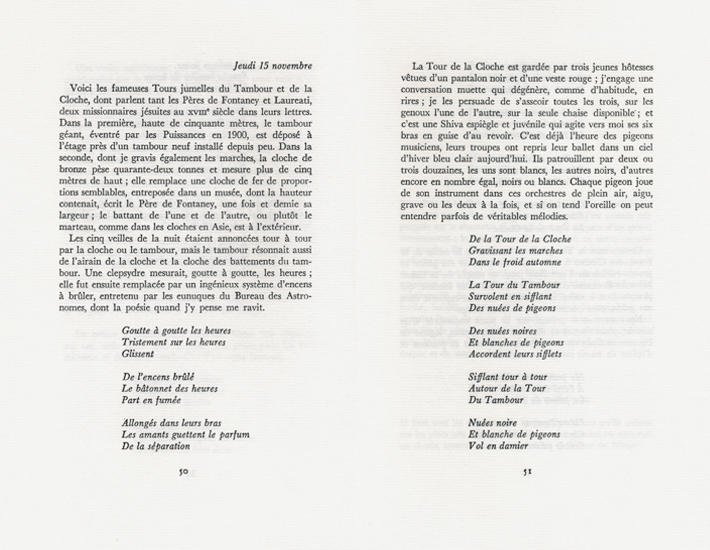 Comment ne pas le suivre dans l’avion qui remonte, comme des échelles à saumons, les fuseaux horaires, jusqu’aux poissons rouges, bleus ou transparents, qu’il retrouve chaque soir devant l’aquarium de l’hôtel ; sur les toits volants, ou en pagode, surmontés de da’wen, qu’il rapproche des caractères, tout aussi incurvés, et habités, de l’écriture chinoise ; ou dans ses joutes poétiques avec des poétesses de Shanghai ou ses rencontres, également inopinées, de danseuses du Bolchoï gazouillant Pouchkine dans un bimoteur en détresse, et quelques jours plus tard flânant comme des flamants roses sur la Grande Muraille ?